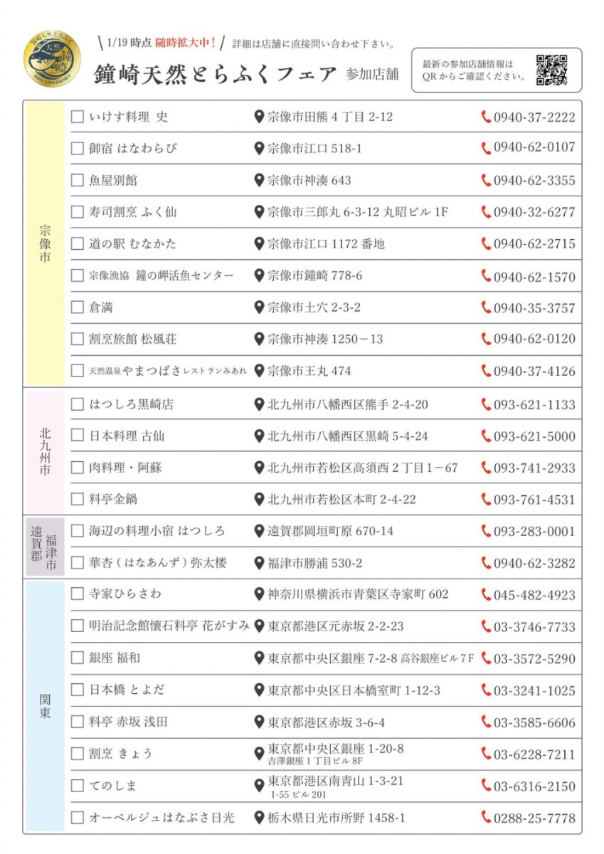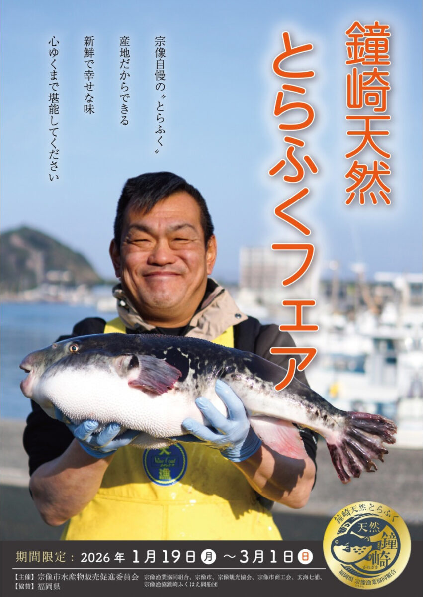 玄界灘と響灘が出合う場所 宗像漁業協同組合 宗像(むなかた)は、福岡県の北側に位置し、福岡市と北九州市の中間にあります。 北方に広がる大きな海は西は玄界灘、東は響灘と二つの海流に分かれ、年間通してたくさんの海の幸に恵まれています。 なかでも上質なアナゴや天然フグ、ヤリイカ、ブリが採れ、特に鐘崎漁港は、県下有数の水揚げ量を誇ります。 旧宗像漁協と鐘崎漁協と二つの漁業組合があり、合併して平成26年4月1日、新「宗像漁協」となりました。 宗像漁業協同組合について 鐘の岬活魚センター 今週の入荷状況 WEEKLY NEW ARRIVAL 2024年7月8日 このコーナーで1週間ごとに入荷状況をお知らせして参ります。 あおはた(100g/300円) くえ あなご(100g/280円) やりいか(100g/440円) いしだい、たこ等、多数の種類の活魚を揃えております。是非お越しください。販売、入荷状況によっては品揃えや値段を変更することがございます。ご確認の際はご一報ください。 お知らせ NEWS 2026-01-27 鐘崎天然とらふくフェアが今年も始まりました! とらふくの美味しさをもっと身近に感じていただきたく、各店舗で様々なとらふく料理を堪能できます✨ 宗像市内を中心に、福津市、遠賀郡、北九州市、関東など幅広い地域で開催されていますので、お気に入りの店を見つけてください😆 店舗詳細は、玄海もんHPへ♪ お知らせ一覧 Topics 最新情報はSNSをチェック! Instagram katsugyo_center さらに投稿を見る Facebook 宗像漁業協同組合 さらに投稿を見る Youtube 業者様へ 当センターは鐘崎漁港で水揚げする漁師から活きの良い魚を入荷し、お客様の多様なニーズに応えるべく、冷凍加工等のご依頼も承ります。詳しくは下記までお気軽にお問合せ下さい。 ●鐘の岬活魚センター 営業時間8:00~16:00 定休日毎週水曜日 0940-62-1570 FAX:0940-62-1662